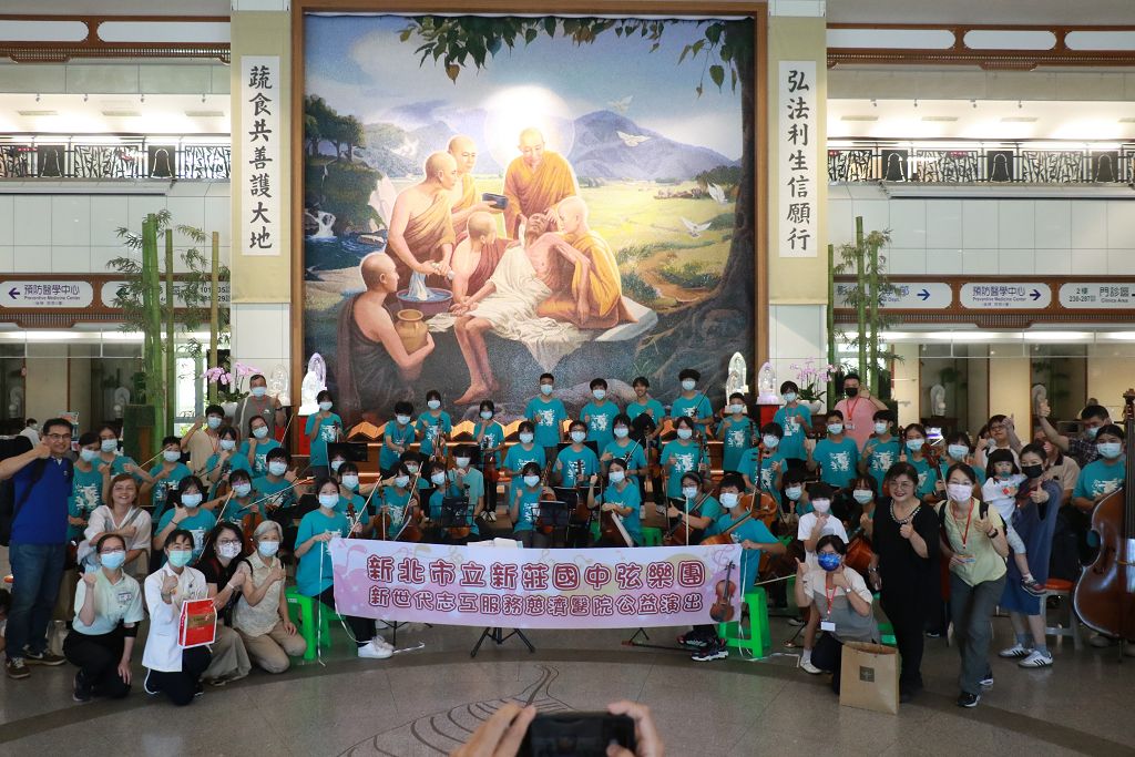 新北市立新莊國中弦樂團,3日來到台中慈濟醫院大廳公益表演,四十位學生臺上合奏「燒肉粽」、「青春嶺」、「天空之城」等十六首耳熟能詳的國內外名曲及臺灣民謠,悠揚樂音吸引來院大德駐足欣賞,暫歇腳步享受一場音樂心靈饗宴。