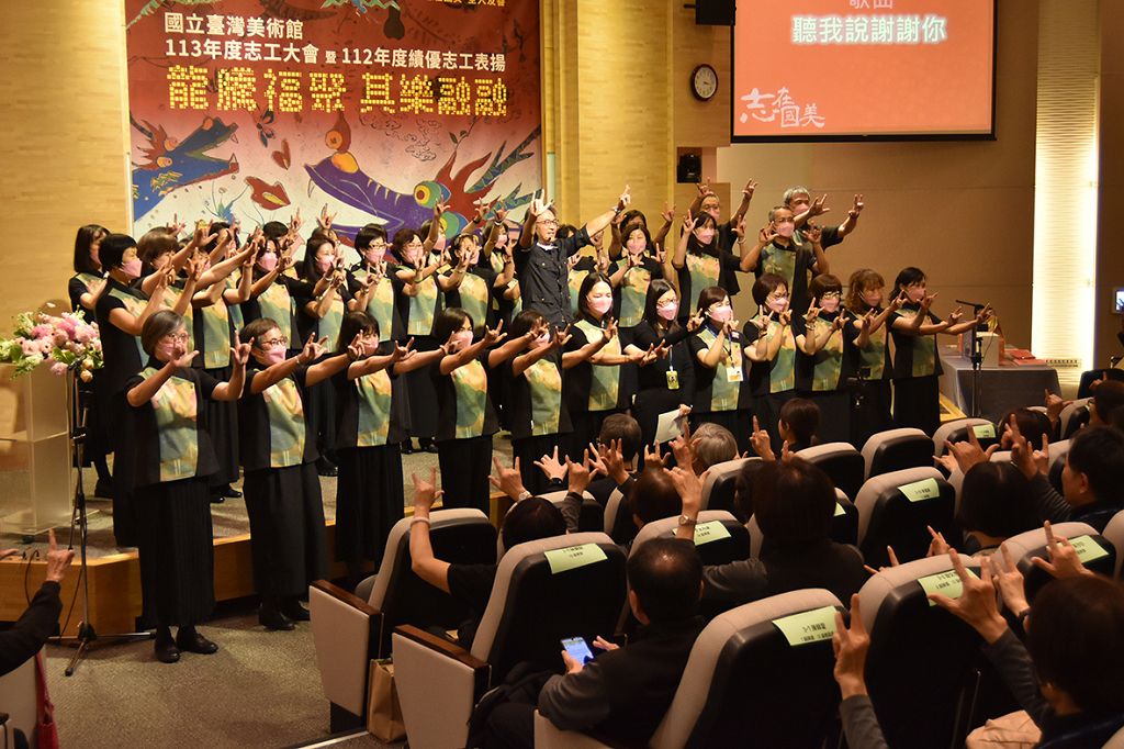 兒童繪本組志工何敏惠分享,因喜愛國美館的環境,自民國93年加入志工隊行列,感受到志工服務的成就感,為此更邀請先生與女兒一起來國美館擔任志工,「讓我們全家更有凝聚力!」解說導覽組志工黃淑華則熱心於服務特殊族群,與手語翻譯老師一起為聽障朋友導覽藝術展品,設計教案與失智老人一起藝術對談,也規劃與小朋友的互動式導覽等,在民國112年透過學習「互動式導覽」課程,所參與設計之教案獲得教案設計優選獎,備感榮耀。副隊長祁俞老師帶頭引領本館志工夥伴,參與分齡分眾的近用服務專才培力課程,投入全人友善服務的各個領域,本身雖非藝術專業,因為對藝術的熱愛,透過充實知識、累積經驗,已成為國美館經驗最豐富的全人友善服務志工之一。