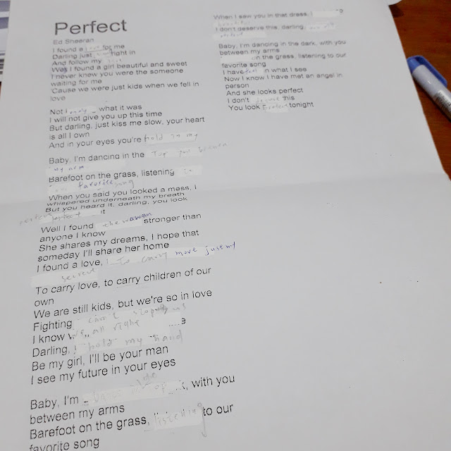 Teacher LYN老師將英文歌詞用力可白塗掉,讓屎蛋媽填入歌詞,哈!足足花了2堂課才完成!