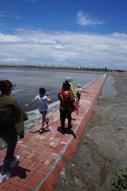 [井仔腳瓦盤曬鹽解說]導遊邊走邊講解台灣曬鹽文化和井仔腳歷史典故,井仔腳鹽田是使用碎酒甕的瓦盤曬鹽,所以鹽質乾淨,屎蛋一家一路上看到大、小蒸發池,井仔腳鹽田曬鹽的過程活生生的出現在眼前,好有趣!