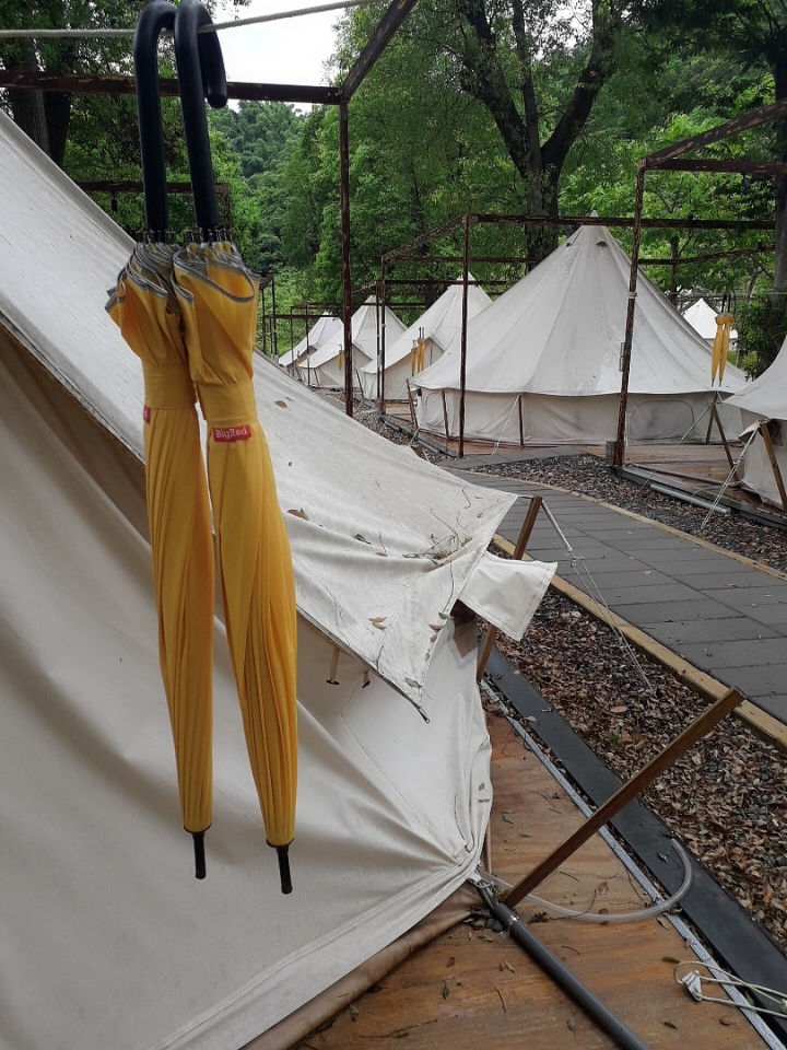 一早山上就下起了綿綿細雨,但雨一下又停了,一出門就看見帳篷上掛著的黃色雨傘,蝶舞澗服務人員什麼時候來掛的,屎蛋媽都沒發現,屎蛋媽温暖在心頭,可以嫁給蝶舞澗嗎?太貼心了!啾咪!