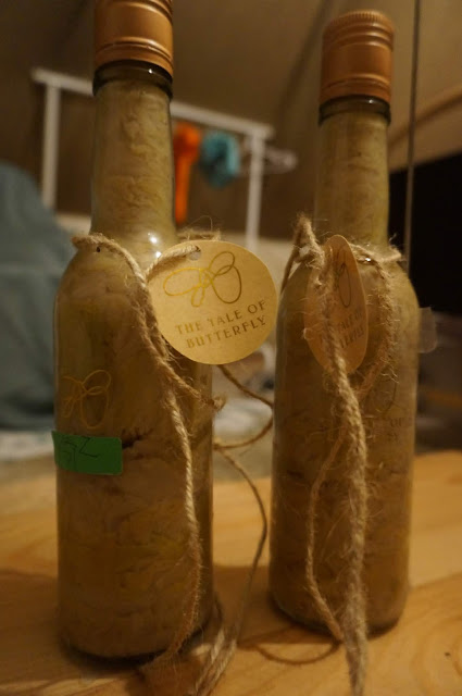 蝶舞澗已把煩瑣的客家高麗菜乾的醃製過程完成了,我們的工作就是將高麗菜乾裝瓶,別小看這裝瓶的動作,可是要不斷擠壓,才能擠壓出美麗的大理石紋路!
