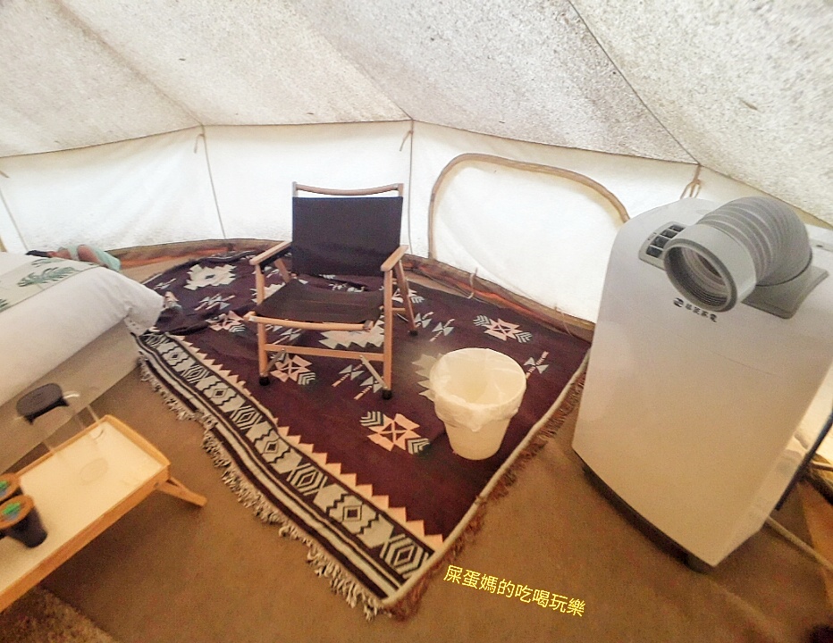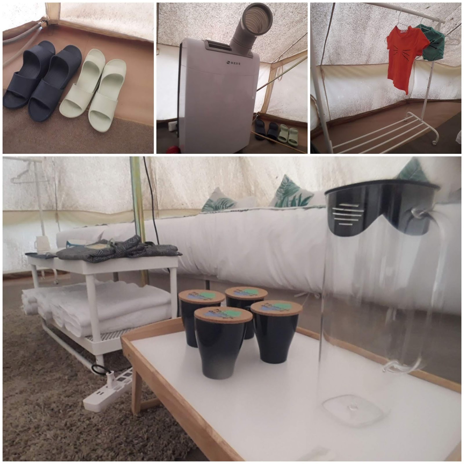 蝶舞澗露營帳篷設施跟飯店差不多,拖鞋、水杯、盥洗用具一應俱全,超大台的冷氣,讓帳篷一下子就涼爽了起來!