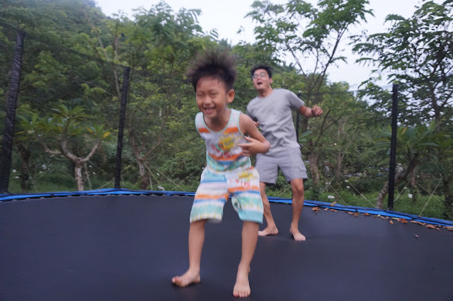 [彈跳床]露營區設有彈跳床設施,在山林間彈跳,感覺很新奇,屎蛋都快撞到鳥兒了呢!(遊玩彈跳床時,別忘了脫鞋進入呦!)