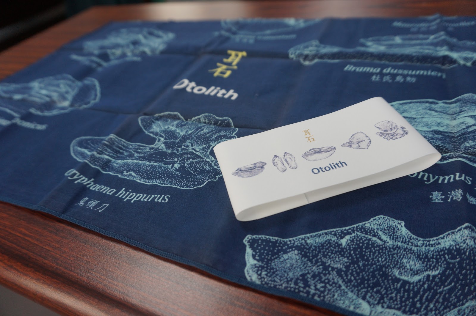 專家提供與海洋相關的贈品,屎蛋拿到與硬骨魚類的耳石手帕,好幸運!