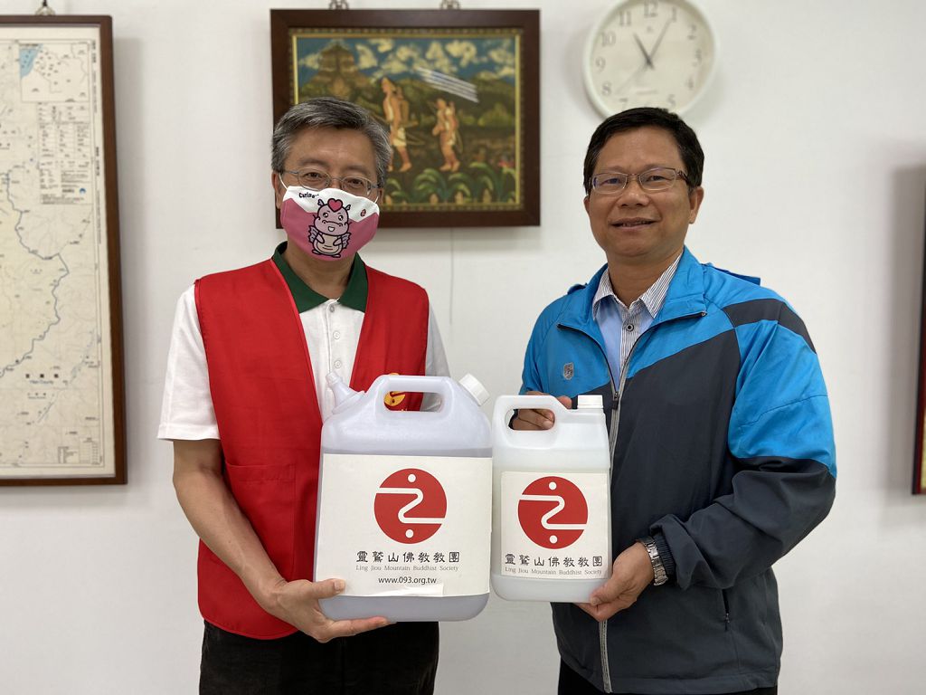 靈鷲山慈善基金會副執行長陳世人(左)代表靈鷲山佛教教團,致贈酒精、洗手乳等防疫物資給尖石國中,由校長彭清宏(右)接受。(圖由靈鷲山佛教教團提供)