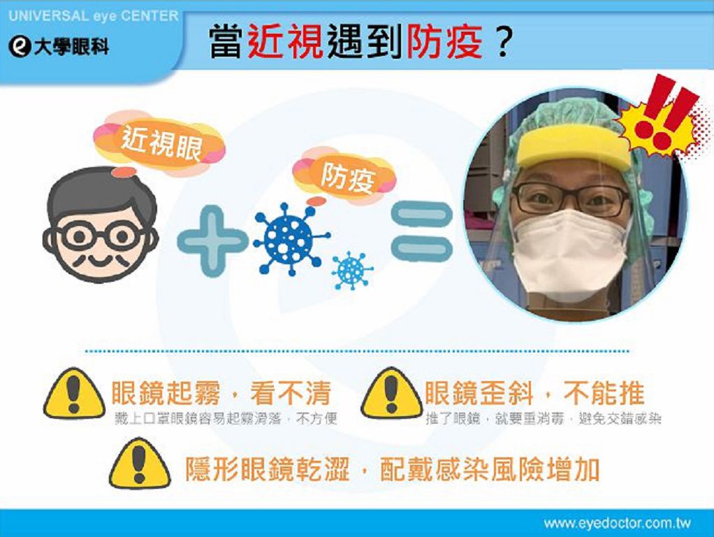 新冠疫情當前,站在第一線的醫護人員是維護我們生命安全的白衣戰士,他們必須長時間配戴口罩、護目鏡及隔離衣等各式防護裝備,對於眼鏡族來說,常造成眼鏡起霧、鏡架歪斜,導致失焦模糊,嚴重影響防疫作戰,成為許多近視醫護人員的最大困擾。