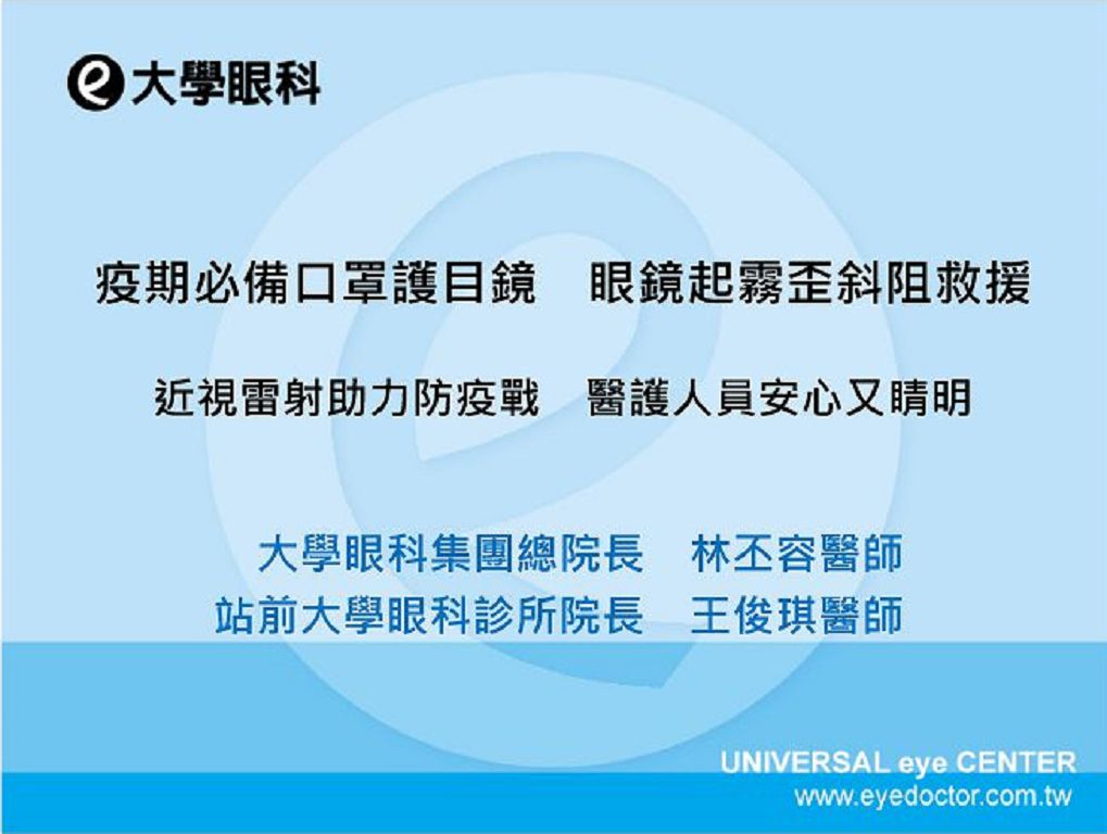 新冠疫情當前,站在第一線的醫護人員是維護我們生命安全的白衣戰士,他們必須長時間配戴口罩、護目鏡及隔離衣等各式防護裝備,對於眼鏡族來說,常造成眼鏡起霧、鏡架歪斜,導致失焦模糊,嚴重影響防疫作戰,成為許多近視醫護人員的最大困擾。