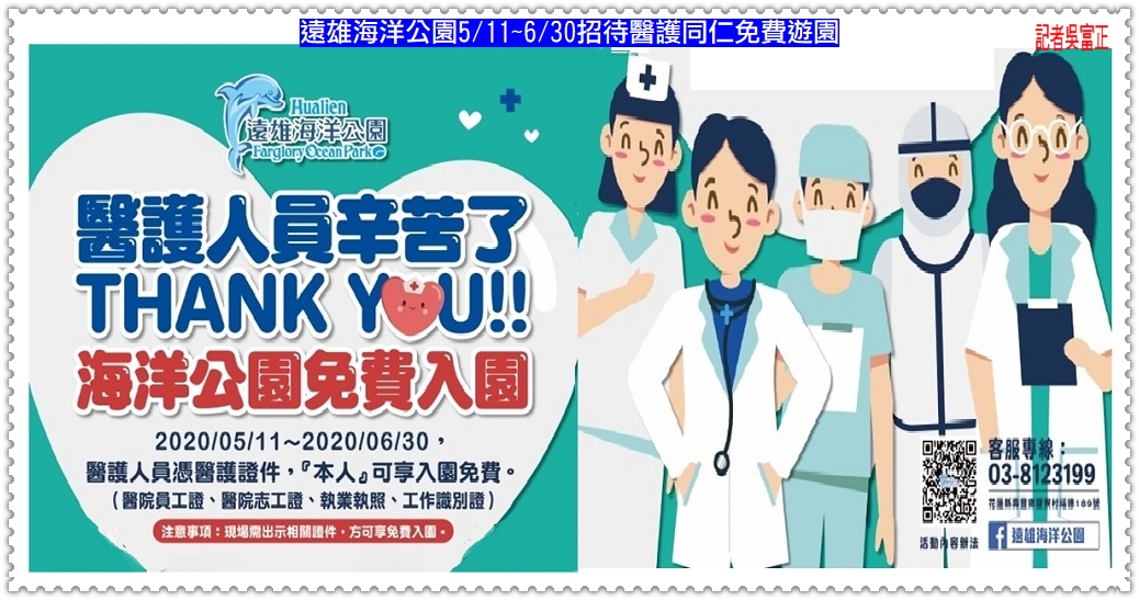 【遠雄海洋公園】為表達對醫護人員抗疫的敬意,推出「醫護人員免費入園優惠」,醫護人員5/11~6/30憑醫護證件(醫院員工證、醫院志工證、執業執照、工作識別證)享入園免費,期望讓第一線醫護人員休假時可以放鬆身心。