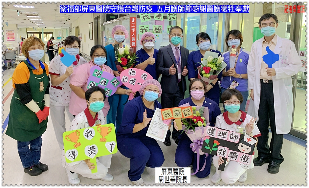 衛生福利部屏東醫院為鼓勵[新冠肺炎]疫情期間支援防疫業務的護理人員,在堅守防疫政策下,仍然用不同方式表揚護理師,用不同以往活動來肯定護理師們的辛勞和工作價值。屏東醫院周世華院長準備500束康乃馨,由護理主管陪同至各單位贈送給第一線護理人員,對護理人員在新冠肺炎期間的犧牲奉獻表達感恩之意,也代表屏東醫院對醫護人員家屬對辛勞的醫護人員支持,醫護人員才能夠無後顧之憂堅守防疫之崗位。