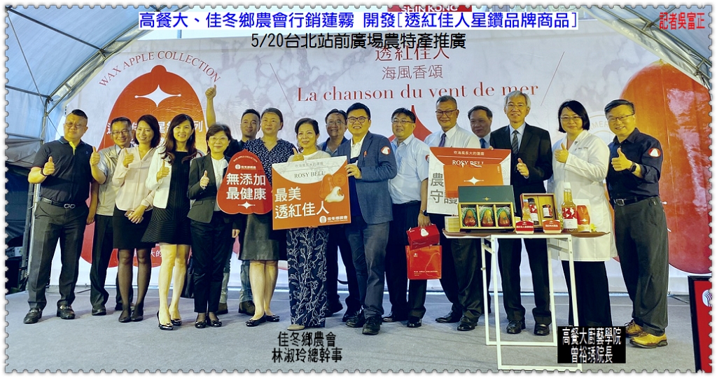 國立高雄餐旅大學、佳冬鄉農會5/20在台北站前新光摩天大樓廣場舉辦《透紅佳人・海風香頌》佳冬蓮霧「透紅佳人星鑽系列」產品發表暨公益推廣活動;佳冬蓮霧的甜度脆度一向頗受好評,「透紅佳人」更是佳冬鄉農會近10年來極力推廣蓮霧的品牌,此次推廣在考量紓困農民物產之餘,高餐大與佳冬鄉農會合作特製【透紅佳人520祝福餐盒】捐贈予台大醫院辛勤抗疫的第一線醫護人員,善盡社會責任並為全民加油打氣,分享甜蜜與幸福。