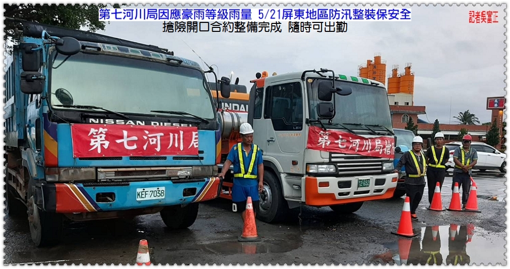 經濟部水利署繼5/14黃蜂颱風視訊會議,5/21再次召開防汛整備視訊會議後,第七河川局針對屏東地區常淹水區進行抽水機預佈檢討,盤點轄區防汛整備情形,立即啟動3台移動式抽水機整裝待命完成,隨時可出發進行淹水地區抽水作業。受到滯留鋒面影響,高屏地區5/21天氣轉趨不穩定,根據中央氣象局天氣預測,5/21下午開始,西南風會逐漸增強,降雨強度及範圍也逐漸增加,到5/22一整天,西南風轉變成西南氣流,高屏地區出現降雨機率增高,南部地區甚至會出現豪雨以上等級的降雨發生。