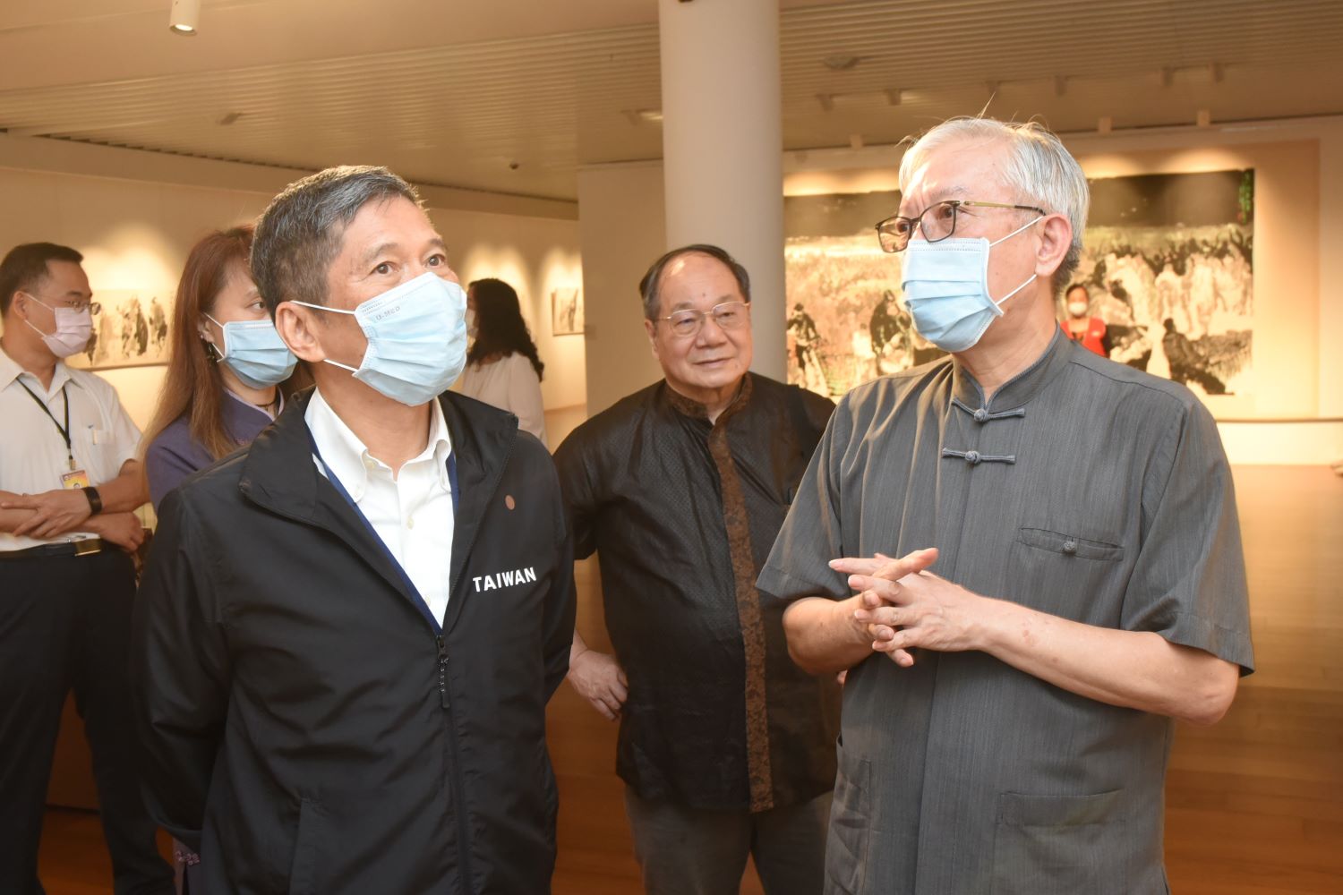 文化部李永得部長今(16)日蒞臨國父紀念館博愛藝廊參觀「最是人間─李奇茂水墨人物傳承紀念展」,親切問候李奇茂夫人張光正女士,並前往中山國家畫廊參觀「翰墨舞霞天—薛平南書法篆刻展」。