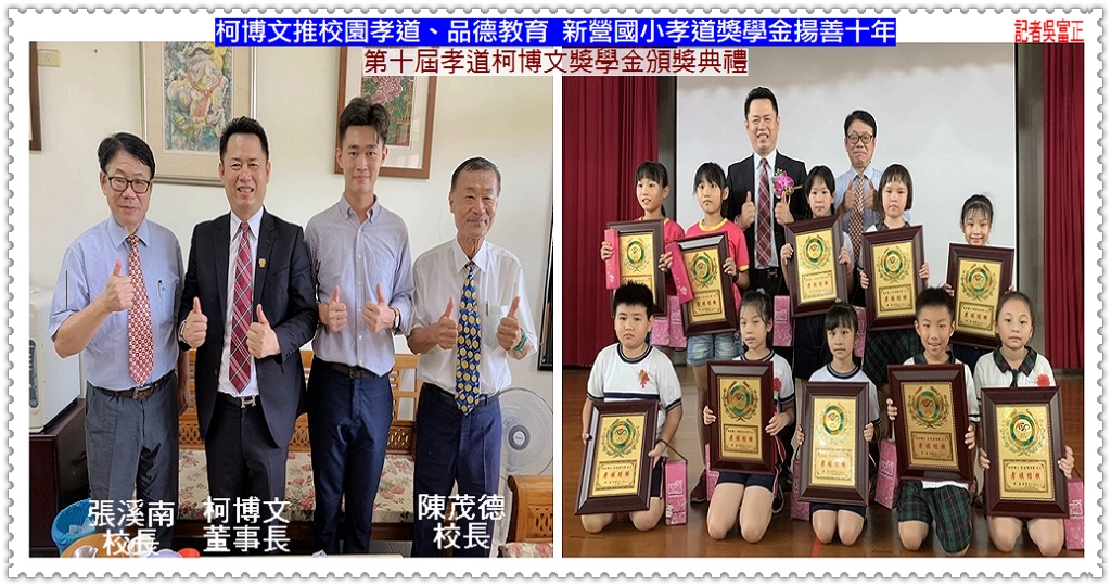 【鎮裕闗西重永化研(股)公司】柯博文董事長致力提倡孝道、品德教育,民國100年接洽新營國小陳茂德校長創設「柯博文孝道獎學金」,鼓勵學生從低年級[弟子規]、三年級[孝道跪安禮]、四年級[為父母洗腳]、五年級[圓父母計畫]、六年級[孝順父母日]實踐於日常生活中;日前新營國小第十屆頒獎典禮上,柯博文也感謝推動孝道的陳茂德校長、張溪南校長,協助十年在校園中種下孝順的種苗。