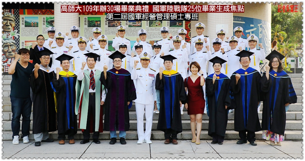 國立高雄師範大學因應疫情關係,「109級畢業典禮」責成各院、系、所自行規畫辦理,吳連賞校長及二位副校長王政彥、廖本煌,則分別在三長陪同下出席主持各場次畢業典禮。6/21計有6場次,是舉辦日中場次最多的一天,上午場由王政彥副校長主持、唐硯漁教務長陪同,下午場廖本煌副校長主持、方德隆學務長陪同,吳連賞校長因受金門縣長之邀,返金門家鄉協助金門大橋通車後未來發展規劃。本日畢業典禮中,各會場充滿溫馨、喜悅畫面,其中國軍25位陸戰隊菁英穿著白甲式軍服拍照,成為最醒目的焦點。