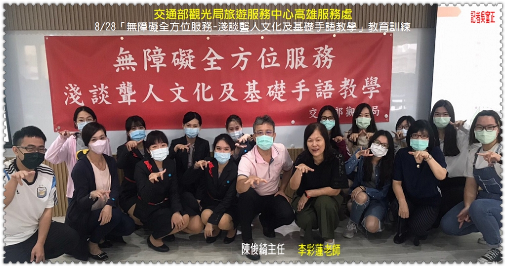 交通部觀光局提供聽障者友善服務8/28無障礙全方位服務教育訓練@民生好報 LINEWS 新聞中心 5 年前 【民生好報-記者吳富正、黃玫菱/2020.08.28.高雄報導】 交通部觀光局為提供聽障者更友善便利的旅遊服務,推行無障礙全方位旅遊環境,8/28於交通部觀光局旅遊服務中心高雄服務處辦理「無障礙全方位服務-淺談聾人文化及基礎手語教學」教育訓練課程。 交通部觀光局【高雄國際機場旅客服務中心】陳俊綺主任表示,本次課程邀聘從事專業手語翻譯工作將近20年,目前擔任高雄市議會會期手語翻譯員李彩蓮老師講座,邀集高雄國際機場各單位、南部各縣市政府(台南、高雄、屏東)觀光單位、南部各公協會(旅館、旅行、觀光協會等)觀光業者及南部各國家風景區管理處(大鵬灣、茂林、西拉雅、雲嘉南、阿里山及澎湖)等第一線服務人員一同參與; 為落實防疫措施,此次課程座位安排遵循1.5公尺之社交距離規範,學員人數控制在50人以下,須於門口量測額溫低於37.5℃始可入館;入館後如無法保持安全社交距離,須全程配戴口罩;以提醒第一線服務人員謹慎防疫的重要。 陳俊綺主任提及,推行無障礙全方位旅遊環境,提供聽障者更友善便利的旅遊服務,是我們第一線服務人員的宗旨,藉由這次難得的機會為身在第一線的櫃檯服務人員量身訂做課程,針對聾人文化、聾人溝通模式等不同主題,以深入淺出的方式帶領學員了解聾人文化,最後實際教導學員基礎手語,讓學員能在未來遇見聽障旅客時派上用場,提升工作效能與質能。 【交通部觀光局】https://www.taiwan.net.tw/
