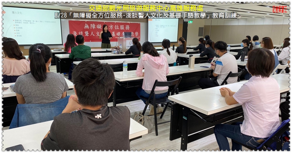 交通部觀光局為提供聽障者更友善便利的旅遊服務,推行無障礙全方位旅遊環境,8/28於交通部觀光局旅遊服務中心高雄服務處辦理「無障礙全方位服務-淺談聾人文化及基礎手語教學」教育訓練課程。