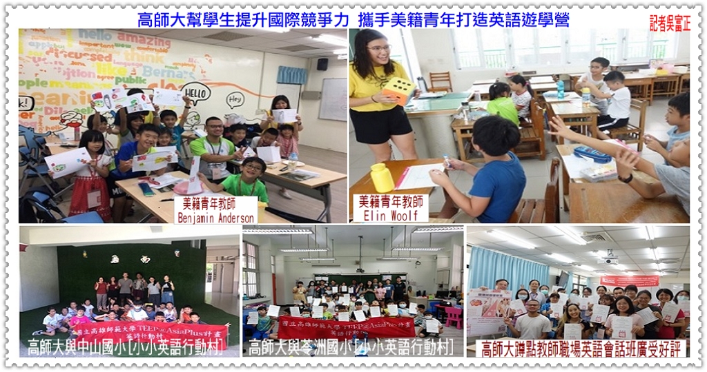 高師大蹲點計畫邀請5位美籍青年至高雄市夥伴學校進行英語教學活動,5位青年教師透過英語系李翠玉主任指導及安排,在高雄市苓洲國小、文府國小、中山國小等三校,辦理為期6周之「小小英語夏令營隊-行動英語村Fun in English」,共計約200名學童參與,提供全美語操作與浸潤式英語口說練習情境。美籍青年教師活潑熱情,充滿教學熱誠,與高雄學童打成一片,獲得學生喝采掌聲。小朋友從透過遊戲、實作和體驗,很自然地使用英語溝通和學習。高師大也安排美籍教師開辦「職場英語會話班 Let’s speak in English」,授課對象為學校行政人員與社區民眾,強化英語職場實務溝通能力。