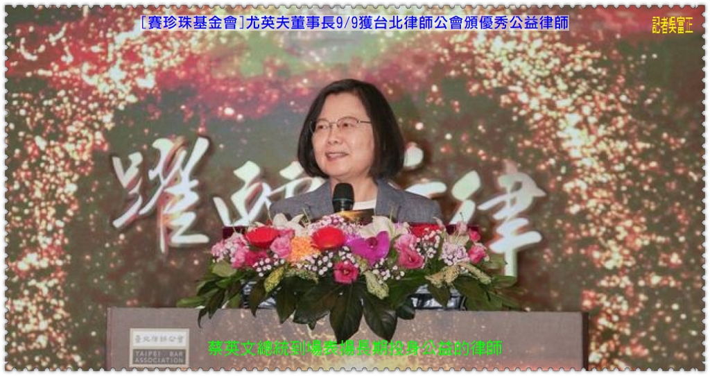 台北律師公會9/9舉行「109年度律師節慶祝活動暨會員大會」,蔡英文總統到場期勉律師們能夠團結所有的力量,讓最優秀、最強而有力的律師隊,做台灣人權法治的後盾,並表揚長期投身公益的律師。