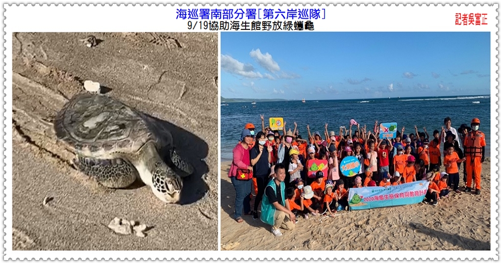 【海巡署】南部分署[第六岸巡隊]從9/8至9/19與海洋生物博物館共計辦理3場於後壁湖保育沙灘海龜野放活動,由海洋生物博物館、四林、大明國小、大江生醫公司等單位,將康復的3隻保育類海龜陸續野放,讓海龜重返海洋的懷抱。海洋生物博物館為達到海洋生態保育之目的,9/19邀請大江生醫公司約30多位民眾參加野放活動,另協請南部分署第六岸巡隊[後壁湖安檢所]同仁共同至後壁湖保育沙灘實施海龜野放;9月野放的3隻保育類綠蠵龜均為遭廢棄魚網纏繞擱淺,由海洋生物博物館團隊細心醫療照護後,恢復狀況良好,經過獸醫評估康復,可將傷癒的綠蠵龜野放回大海,同時對海巡署同仁在海洋生態保育及維護工作上的努力表示肯定。
