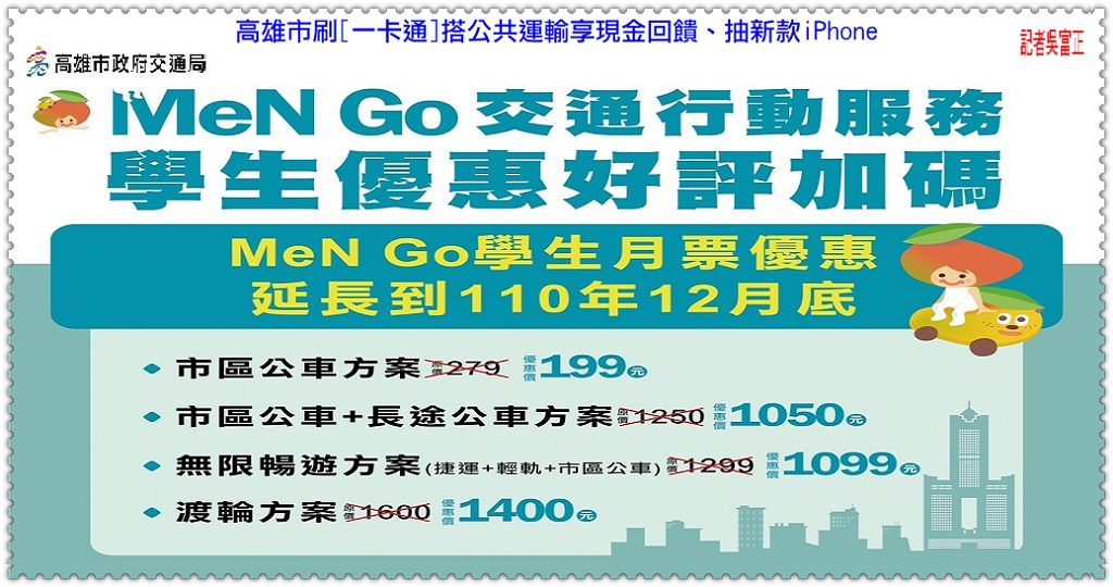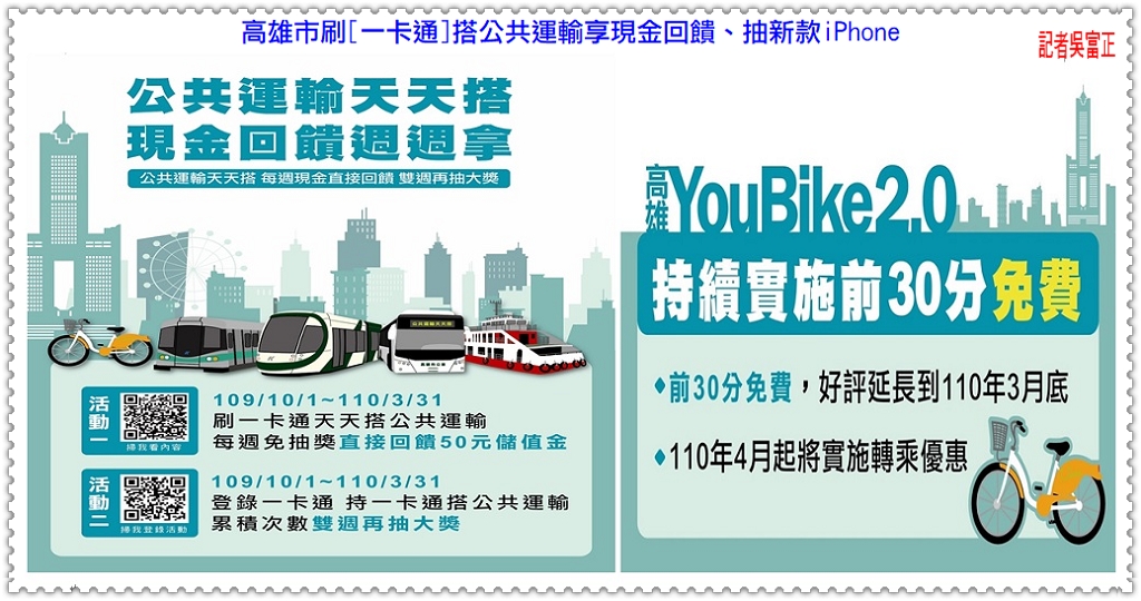 【高雄市府交通局】表示,除了「公共運輸天天搭」系列好康活動外,為照顧年輕學子及鼓勵市民朋友多多使用公共運具,將目前廣獲好評的「YouBike前半小時免費措施」延續至110年3/31、「MeN Go學生月票優惠」至110年12月底,創造更美好、便利、低碳、綠能的交通運輸環境。「公共運輸天天搭 現金回饋週週拿」活動,週一至週日天天刷一卡通搭乘高雄市公車、捷運、輕軌、渡輪、YouBike任一公共運具,不須登錄即可享週週50元儲值金回饋(限有刷卡扣款或月票搭乘,社福卡免費優惠及YouBike前半小時免費不納入計算),民眾可自10/19起至一卡通網頁(https://www.i-pass.com.tw/ips/KHLP/UI/)查詢回饋金符合資格情形,並於該週隔2週後,持一卡通至捷運站服務台辦理回饋金加值。