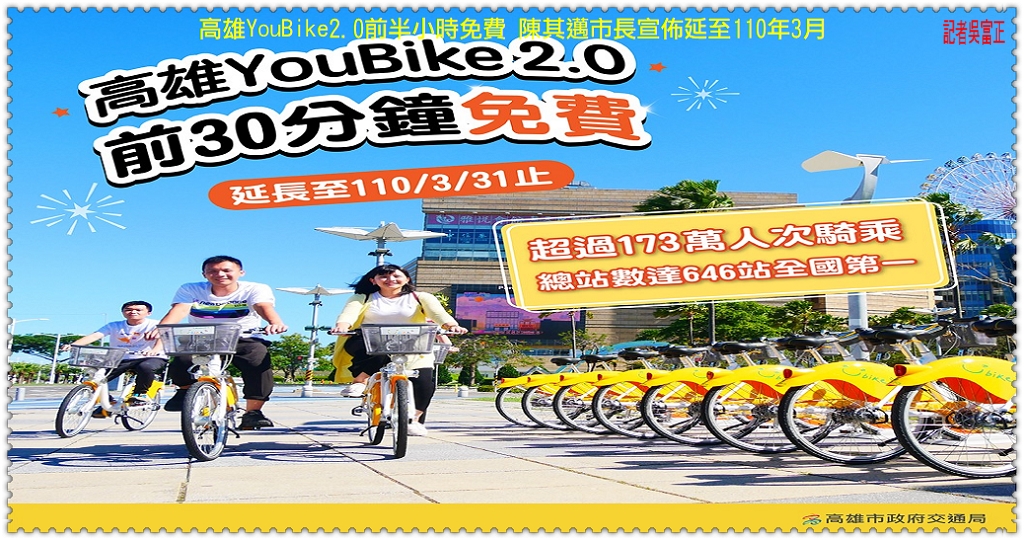 「高雄YouBike 2.0」公共自行車系統7月起正式營運,在【高雄市府交通局】積極辦理建站作業下,截至9/25全市已建置完成646處租賃站,站點數全國第一,且短短3個月使用人次已突破173萬。陳其邁市長表示,為鼓勵市民多體驗高雄市公共自行車的便利性,並養成使用綠色運具的習慣,高雄YouBike2.0原定9/30截止的前30分鐘免費騎乘優惠,將延長至110年3/31,歡迎市民朋友多加利用。