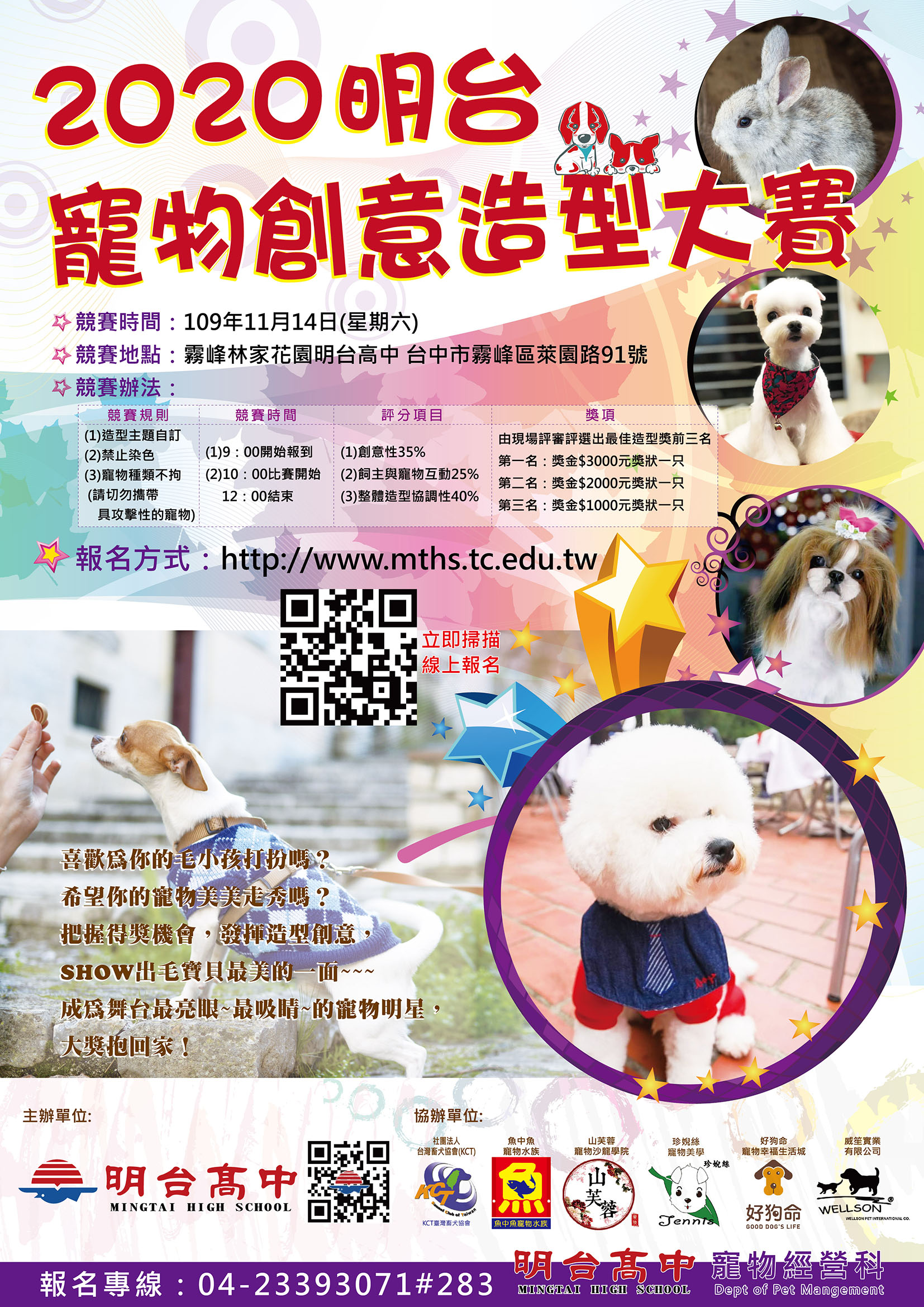 明台高中於109年11月14日(星期六)上午在國定古蹟霧峰林家花園舉辦「2020明台寵物創意造型大賽」,個人或團體均可報名,喜歡為你的毛小孩打扮嗎?希望你的寵物美美走秀嗎?把握機會,發揮造型創意,SHOW出毛寶貝最美的一面,留下美麗精采的回憶!當天知名寵物連鎖店會設攤贊助有意義又有創意的活動!
