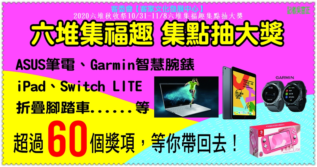 「五穀豐登慶秋收-2020六堆秋收祭」系列活動,活動期間推出「六堆集福趣集點抽大獎」活動,民眾於活動期間,凡參與秋收祭各項活動,就可獲得1個章,集滿5個戳章,即可參加「集福遊戲」,兌換摸彩券乙張,均會在11/8閉幕活動中抽出所有獎項,獎項有筆電、GPS 智慧腕錶、iPad、折疊腳踏車、LED保溫瓶等大獎,歡迎大家到六堆客家文化園區坐尞。