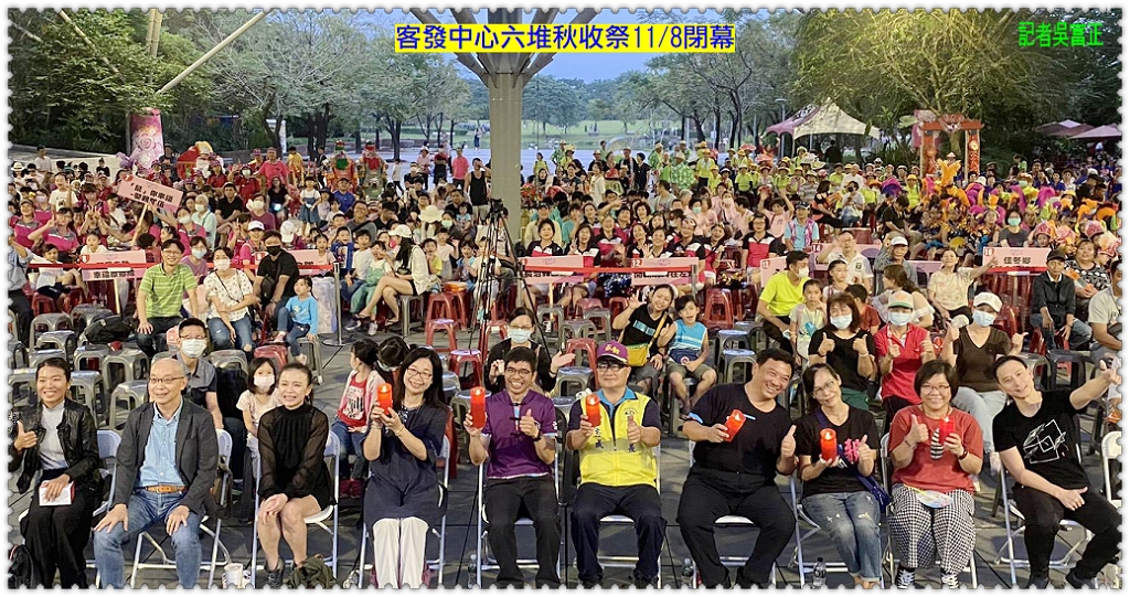 客委會【客家文化發展中心】六堆客家文化園區「2020五穀豐登慶秋收」跨二週的秋收祭系列活動,11/8下午圓滿閉幕,由客發中心何金樑主任、屏東縣府客務處陳麗萍處長、高雄市美濃區鍾炳光區長、新埤鄉林志成鄉長及21個高屏地區優秀隊伍,共同慶豐收踩街遊園,並以「蠟燭點光-靚靚六堆」作為共創美好六堆儀式,象徵客家精神綿延不絕,預告「六堆秋收閉幕,客庄活動接續」,接下來高屏六堆各鄉區會非常熱鬧,一鄉接一鄉,春夏秋冬都有精彩活動持續上演。
