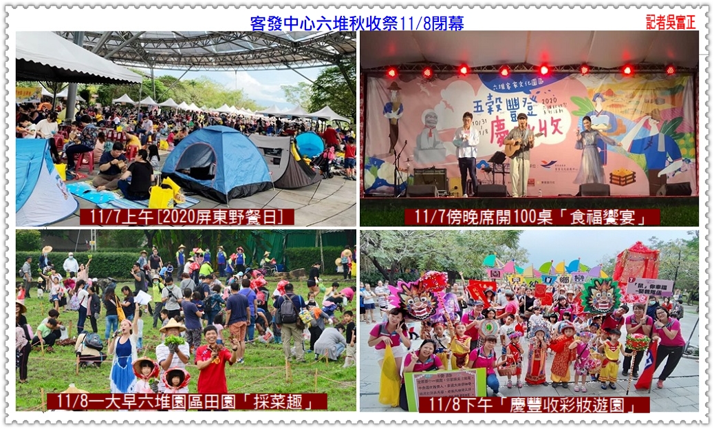 「2020五穀豐登慶秋收」活動天天都精采,秋收祭期間吸引近4萬人共同歡慶秋收;六堆客家文化園區11/7上午[2020屏東野餐日]「尞客庄‧趣野餐」串聯周邊機關、館舍及學校一起辦理,讓民眾透過體驗認識客庄美食文化、生活藝術、產業特色;11/7傍晚席開100桌「食福饗宴」推出六堆在地客家好味緒來感謝大家,今年邀請六堆美濃第三代主廚劉春樹師傅,利用六堆在地食材料理出最在地客家美味;甘霖下,大家共下食福真生趣,現場與來客庄之好友,共寫一段六堆美妙記憶。11/8一大早六堆客家文化園區田園進行「採菜趣」活動,現場吸引近400人來當一日農夫採菜體驗;