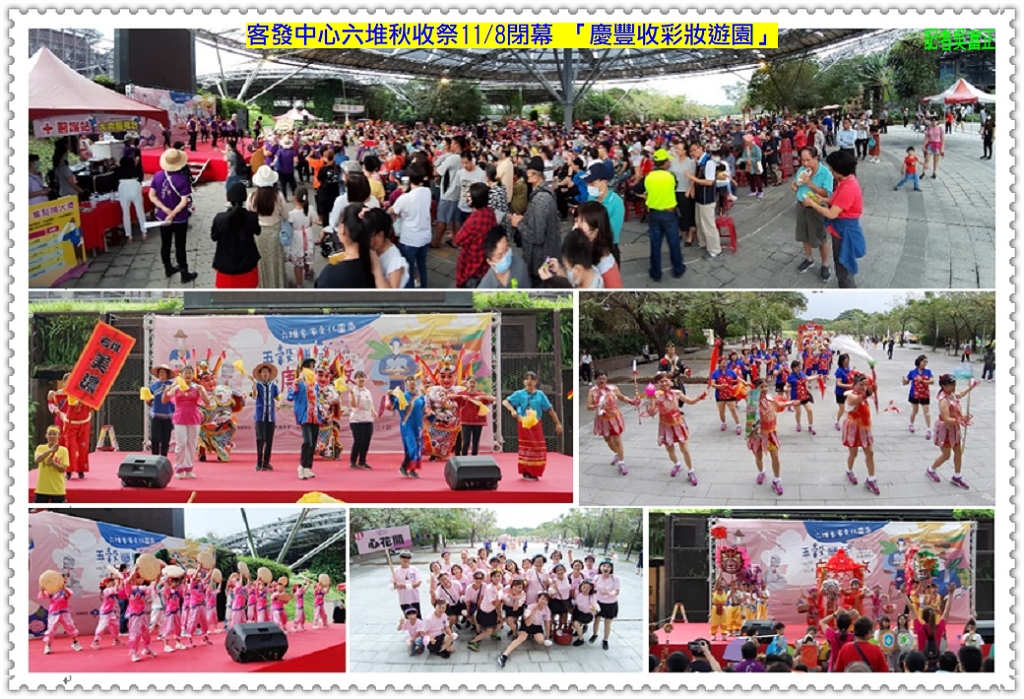 11/8下午「慶豐收彩妝遊園」活動,聚集六堆12鄉區21隊特色團隊及原住民朋友,由六堆客家文化園區好客廣場起沿著迎賓步道至傘架聚落廣場踩街遊行,展現各鄉區特色、技藝、舞蹈、音樂表演與園區民眾齊樂同歡。