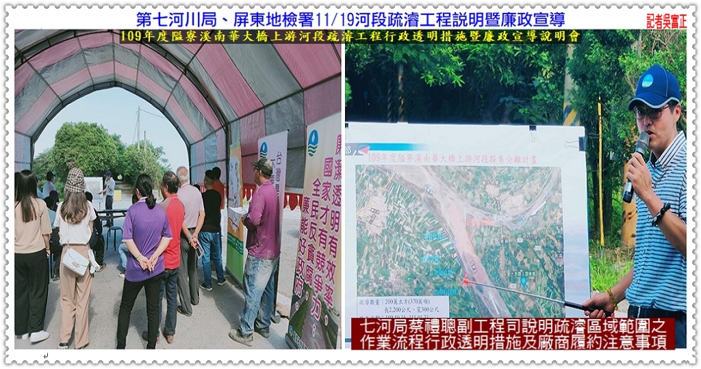 經濟部水利署【第七河川局】11/19辦理「109年度隘寮溪南華大橋上游河段疏濬工程行政透明措施暨廉政宣導說明會」,由李宗恩局長主持,邀請臺灣屏東地方檢察署魏豪勇主任檢察官共同參與。