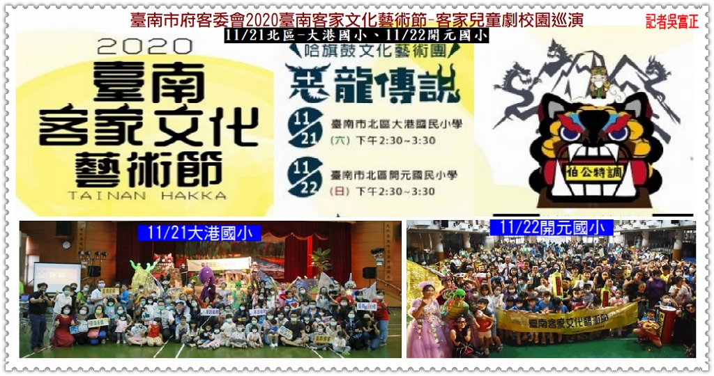 【臺南市政府】鑑於語言是族群文化的核心,更是構成族群認同及文化傳承的重要元素,客家政策規畫首重客語復振,特邀優秀藝文團隊「哈旗鼓文化藝術團」,以客家常民文化石獅公傳說為故事主軸,11/21、11/22於北區大港國小及開元國小進行校園巡演「惡龍傳說」,傳達環境生態保護、守望相助精神,及愛與包容的氣度;臺南市長黃偉哲夫人劉育菁老師、沈震東議員、陳怡珍議員、蔡旺詮議員、蔡筱薇議員均到場觀賞,及對市府積極推廣客家文化表示支持。