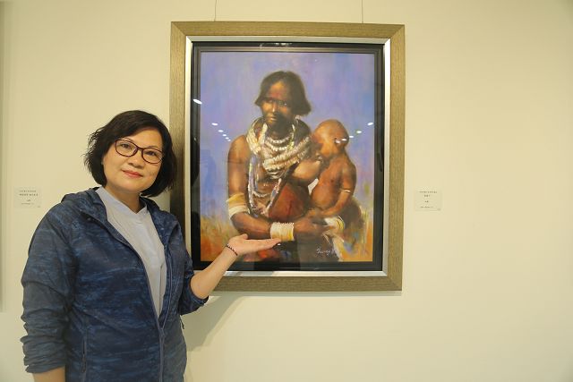 「母與子」一對非洲母子哺育依偎的畫面,離我們千里遙遠,卻連結子女思念母親的形影及兒時記憶,母子連心的愛恆久珍貴。「緊靠著的幸福」,以歐洲古典寫實技法勾勒出安定美好,幸福祥和的畫面。