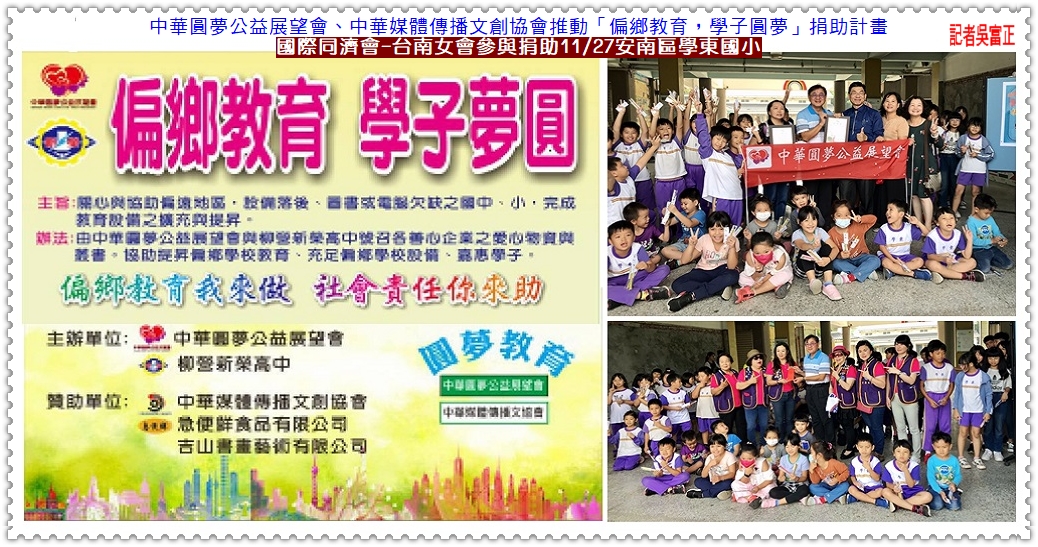 中華圓夢公益展望會偏鄉教育 國際同濟會-台南女會參與捐助11/27安南區學東國小學子圓夢@民生好報 LINEWS 新聞中心 5 年前 【民生好報-記者吳富正、黃玫菱/2020.11.27.台南報導】 【中華圓夢公益展望會】許旗成理事長、【中華媒體傳播文創協會】賴美玉理事長推動「偏鄉教育,學子圓夢」捐助計畫持續展開,11/27捐助學校為台南市安南區學東國小,【國際同濟會-台南女會】愛心不落人後,此次也一同參與公益捐助,當天受到全校師生熱烈歡迎。 學東國小陳禎祐校長表示,感謝【中華圓夢公益展望會】、【中華媒體傳播文創協會】關懷,帶動社會願意付出善心的團體,讓孩子的未來與學校的教育得於落實;做有用的人,先要有明確的做人觀念與健康心態。謝謝【中華圓夢公益展望會】、【中華媒體傳播文創協會】與【國際同濟會-台南女會】以身作則,教會小朋友樂於助人的善行。 【中華圓夢公益展望會】許旗成理事長與學生互動表示,學東國小學子都非常純樸、熱情有活力,期望他們的未來都能保持這樣的心態,方能迎向自己的夢想,向更高遠的目標前進。