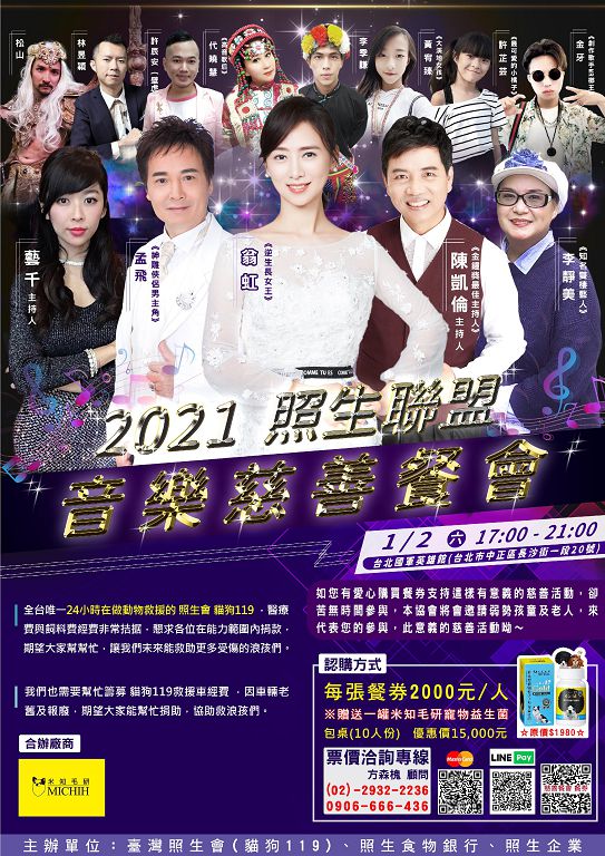 2021年01月02日 (星期六)晚間,台灣照顧生命協會將在台北國軍英雄館,舉辦一場慈善餐會,歡迎社會大眾踴躍報名參加,認購餐卷每張新台幣2,000元,並贈送一罐米知毛研寵物益生菌(原價新台幣1,980元),預計席開25桌,也歡迎各界包桌,一桌10人份,優惠價新台幣1萬5仟元,如果公司行號將要舉行聚餐或尾牙,歡迎來慈善餐會包桌,除了美食饗宴之外,大會將邀請知名藝人前來站台,表演精彩節目,如果純粹報名支持照生會,而不出席餐會,或者做愛心購賣餐卷支持這樣有意義的慈善活動,卻苦無時間參與,照生會將邀請弱勢孩童及老人,前來參加餐會,讓弱族群感受到溫暖的一面。