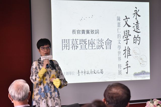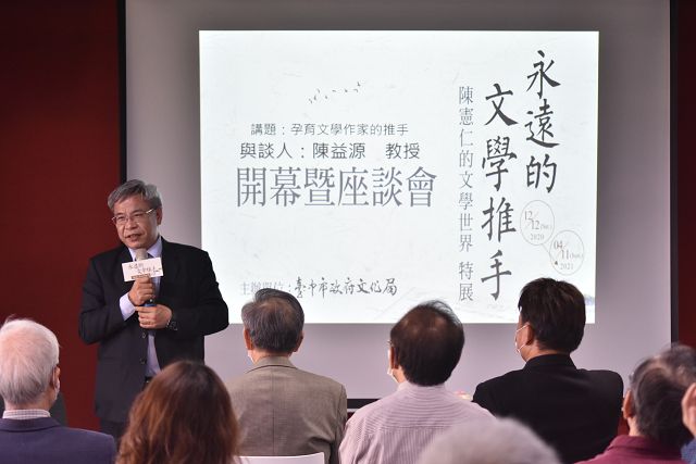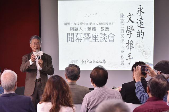 【永遠的文學推手-陳憲仁特展】於12月12日在悠揚的古琴樂曲中揭開序幕,當日亦同步舉辦座談會,來自文學圈、學術圈等各界好友齊聚臺中作家典藏館,現場貴賓包含臺中市政府文化局曾能汀副局長、臺中市政府市政顧問張山明、主持人羅文玲博士、策展人方秋停老師、作家張曼娟、作家林廣、作家林德俊等;作家蕭蕭與成功大學陳益源教授則和現場來賓分享作家眼中的明道文藝、陳憲仁老師及文壇的關係等。展區特別由陳憲仁老師為與會觀眾導覽,本檔展覽展示作家手稿、書信、剪報、照片、獎座等,呈現陳憲仁的文學世界,希望讓更多民眾認識他令人敬佩的文學成就,亦可洞見一個文人能有的良善與光熱。