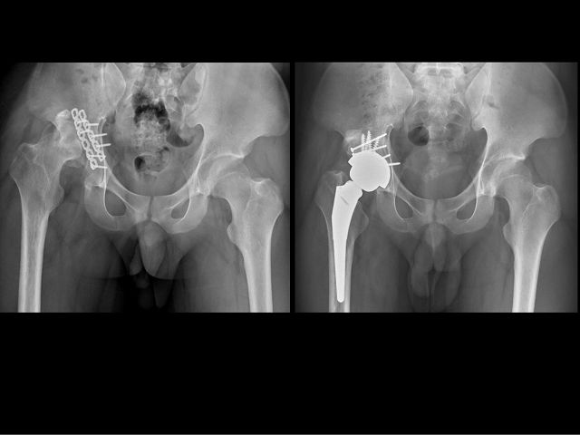 為讓男大生恢復走路重拾生活品質,李芳材、楊鎮源協同關節重建科主任蕭敬樺共同擬定手術計畫。蕭敬樺醫師解釋,首先為病人置換人工髖關節考量其髖關節因錯位有嚴重骨缺損,髖臼就像破了洞的碗,醫師透過院內骨骼銀行異體骨移植填補破洞後,再置換人工髖關節到正確位置,讓髖關節恢復功能同時也一併改善長短腳。