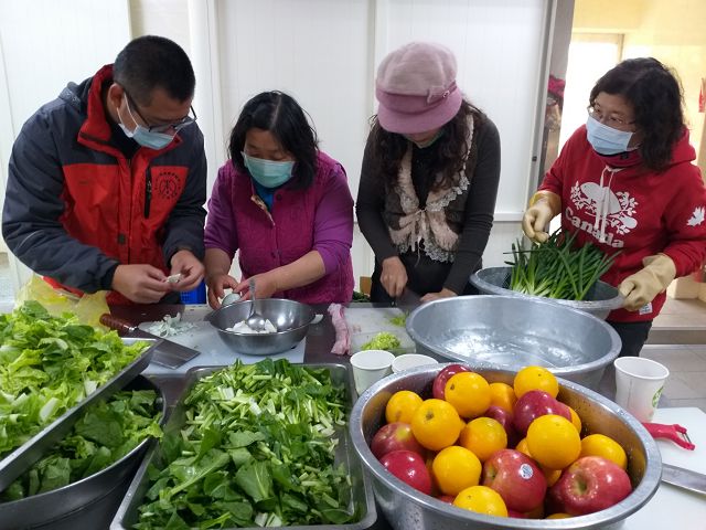 沙鹿東玄宮善食團由林麗召女士帶領近30位志工前來義煮,早上8點即進入喜樂院區預備食材,一群人在廚房及四周圍分工合作,洗菜、切菜、洗水果、製麵皮、包小龍包、擺蒸籠,志工們奉獻假日休息時間,來到喜樂院內親手烹煮愛的饗宴,有熱呼呼的鮮美小籠包、獨門的滷苦瓜、好吃的炒青菜,還有爽口鹹粥,鮮甜的花枝,美味的水果讓喜樂的孩子們在寒冷的冬季裏,吃到暖暖的美食餐!